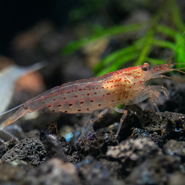 The Amano Shrimp is a highly effective freshwater algae-eating shrimp, widely praised for its ability to clean aquariums while maintaining a peaceful and active presence. With its translucent body and dotted stripe along the side, this shrimp blends in beautifully with natural aquascapes. Ideal for planted tanks, it thrives in stable environments and is best kept in groups.
